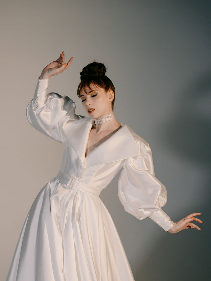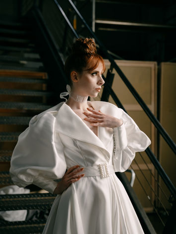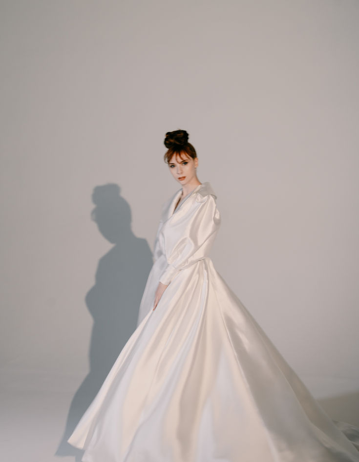 Alexis is a structured Mikado satin wrap coat designed to make an entrance. With voluminous sleeves and a bold collar, it adds drama and polish to any bridal look. Whether worn over a gown or styled on its own, Alexis brings a touch of high fashion to every moment. Alexis is now part of our archives, but her studio sample is still available through the link below.