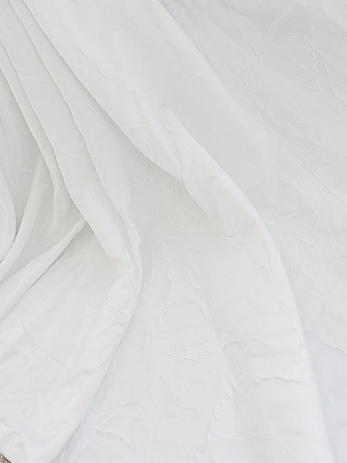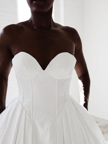 Capri is made in a white luxe satin with embossed florals and soft sweeping leaves that give the ballgown skirt beautiful texture. The Basque waist and structured bodice shape you in the best way, the pockets are tucked right into the skirt (yes, pockets!), and the corset back gives that adjustable, comfortable hold every bride appreciates.