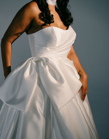 Crafted from luxurious Mikado satin, this ballgown features a pleated bodice, a chic bubble hem, and a daring slit; each detail designed to reflect your determination and confidence. Mila isn't just a gown. It's a statement of power, presence, and unapologetic style. The gown includes a detachable bow, and a structured neck collar.